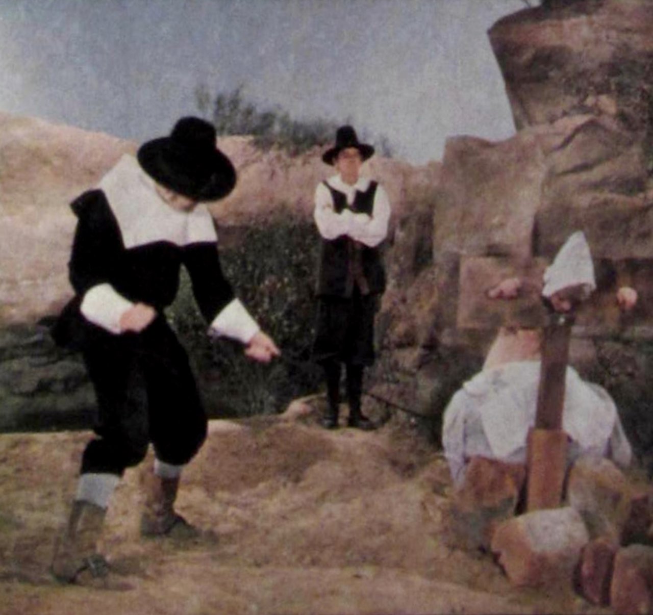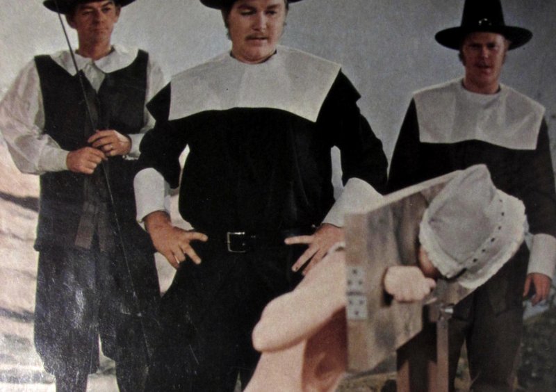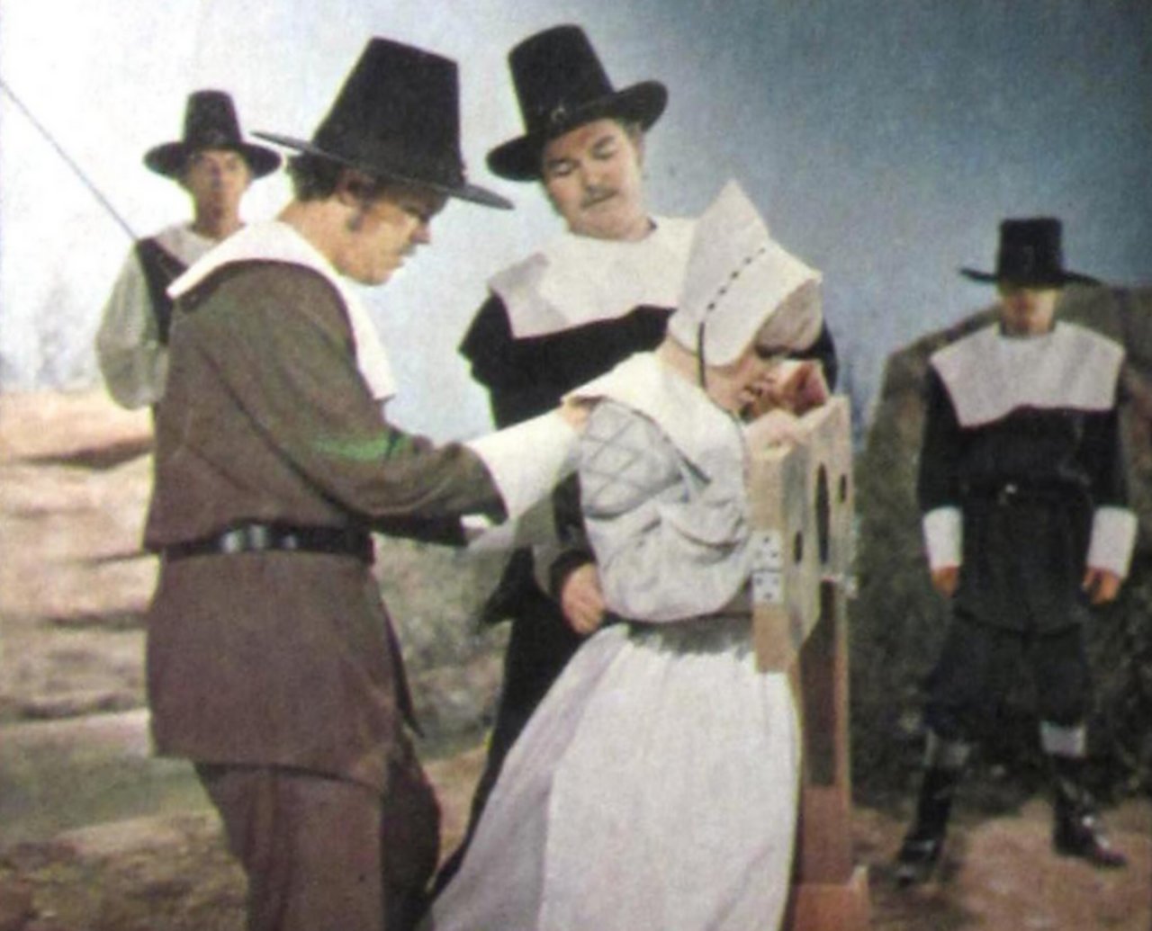 Ah, those brutal Puritans, whipping at the drop of a hat! These lurid public whipping scenes are promotional photos for the 1969 movie Starlet, famously the first movie ever to promote itself with an XXX rating.