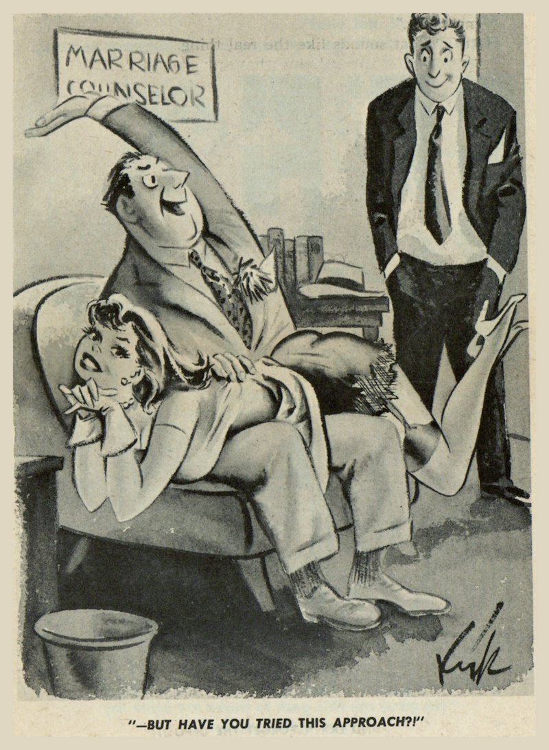 In this Kirk Styles cartoon from Humorama, our marriage counselor (who would so totally lose his professional license if he tried this sort of “hands on” approach in the twenty first century) demonstrates for a hapless but happy husband what his relationship has hitherto been lacking. And of course, what makes the cartoon extra wonderful is the “cat who ate the canary” look of total utter delight on the spanked wife’s face. She knows she’s about to be in a spanking relationship and she does not mind even a little bit!