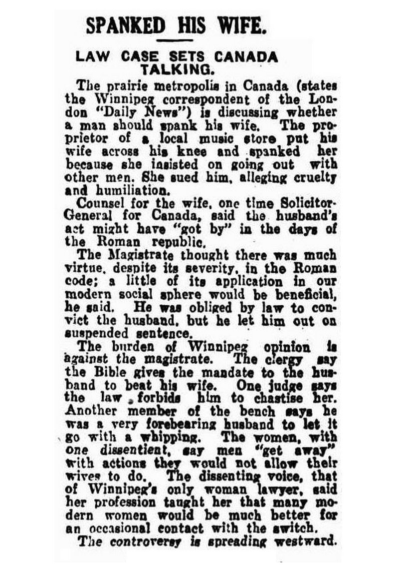 LAW CASE SETS CANADA TALKING.The prairie metropolis in Canada (states the Winnipeg correspondent of the London Daily News) is discussing whether a man should spank his wife. The proprietor of a local music store put his wife across his knee and spanked her because she insisted on going out with other men. She sued him, alleging cruelty and humiliation. Counsel for the wife, one time Solicitor General for Canada, said the husband’s act might have ‘got by’ in the days of the Roman republic. The Magistrate thought there was much virtue, despite its severity, in the Roman code; a little of its application in our modern social sphere would be beneficial, he said. He was obliged by law to convict the husband, but he let him out on suspended sentence. The burden of Winnipeg opinion is against the magistrate. The clergy say the Bible gives the mandate to the husband to beat his wife. One judge says the law forbids him to chastise her. Another member of the bench says he was a very forebearing husband to let her go with a whipping. The women, with one dissentient, say men ‘get away’ with actions they would not allow their wives to do. The dissenting voice, that of Winnipeg’s only woman lawyer, said her profession taught her that many modern women would be much better for an occasional contact with the switch. The controversy is spreading westward.