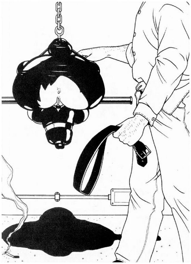 She’s trussed up tightly in a shiny rubber ball, in the classic Benson fashion. But there’s plenty enough of her bottom showing to make this belt spanking effective: