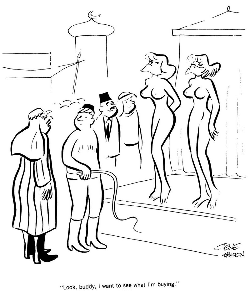 The caption reads “Look, buddy, I want to see what I’m buying!” The cartoon is from the December 1965 issue of Gentleman magazine. I’m trying to convince myself that the cartoonist simply couldn’t be bothered to draw fingers or toes very well. Otherwise, the whole scene takes on a very creepy alternate-worlds lizard-men fantasy vibe…