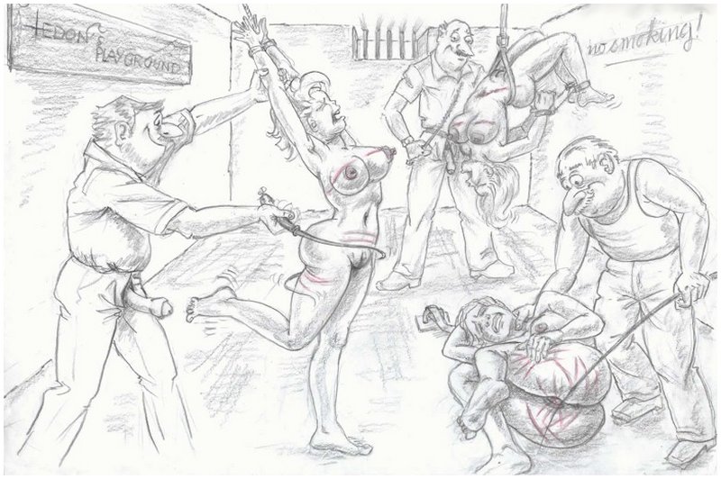 Artist Hedon clearly had a lot of fun drawing this whip “playground” pain sex dungeon: