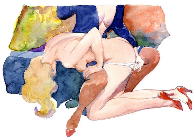 We’ve seen a lot of OTK spanking art here on Spanking Blog over the years, but it’s rare to see any that’s as colorful as this watercolor by Leone Frollo: