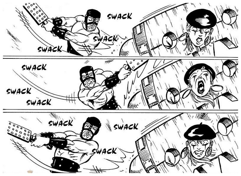 He caught him a mime, and now he wants to hear her voice, even if he has to spank it out of her with a paddle!