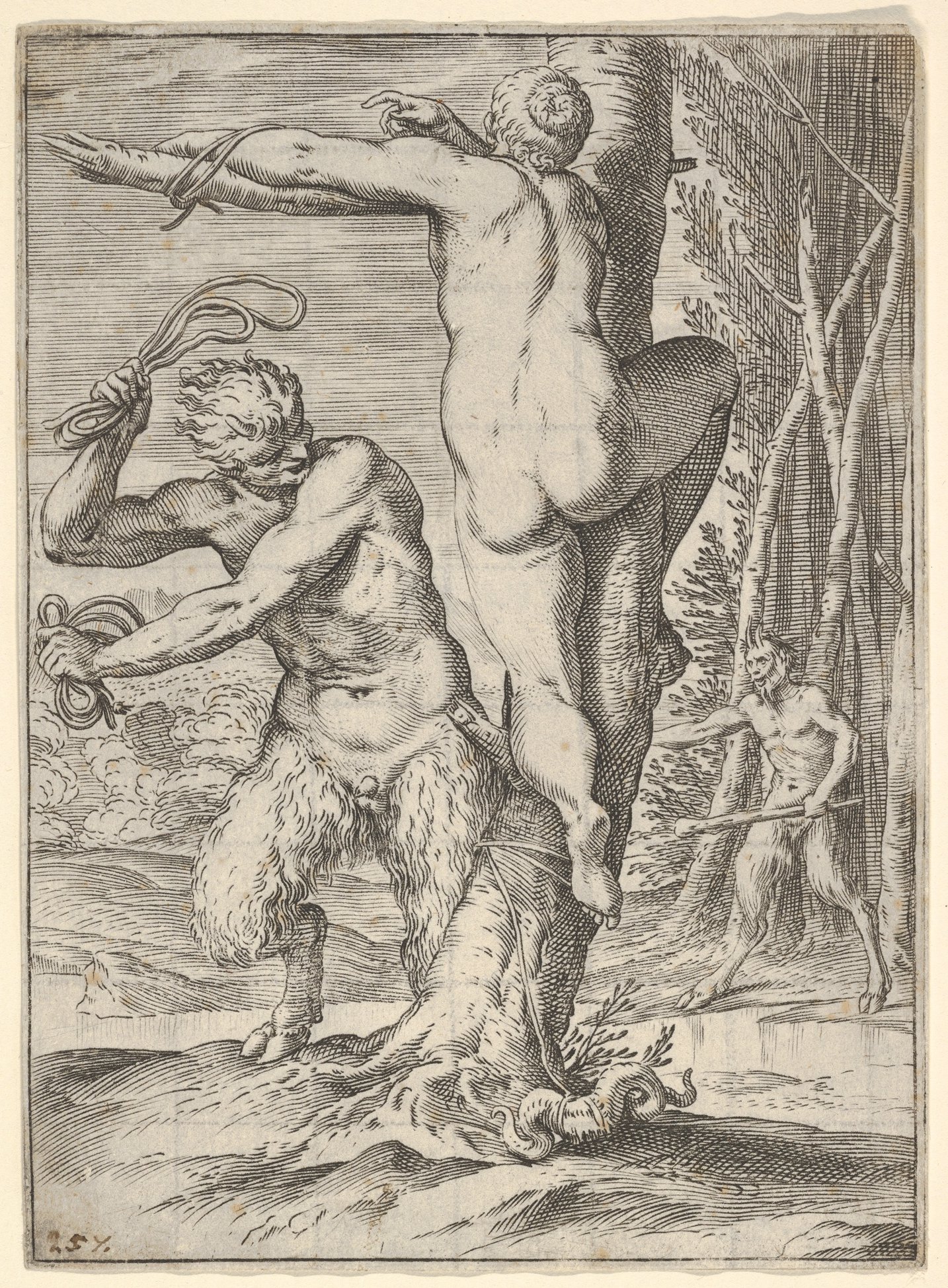 The artwork is called “Satyr Whipping A Nymph” or sometimes “Satyr Flogging A Nymph” and it’s by Italian printmaker Agostino Carracci, usually attributed to his Lascivie. What that means, precisely, is obscure, as a page at the British Museum points out: