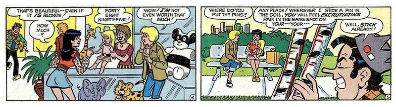 Voodoo doll fun has been a lighthearted part of our popular imagination for a very long time. The voyeuristic thrill that Jughead is taking in watching Veronica Lodge menace Betty with a pretty blonde voodoo doll in this strip from Betty & Veronica No. 201 back in March of 1973 is almost unseemly: