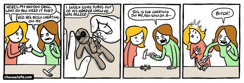 One good thing about a sex doll, anyway, is that it won’t cheat on you. Loyalty should never be overrated! You start playing around with the eldritch magic of voodoo dolls and you may start finding out things you never wanted to know about the more fallible people in your life. Also, a word to the wise: unless your conscience is snow-white clean, don’t go loaning out your voodoo doll!