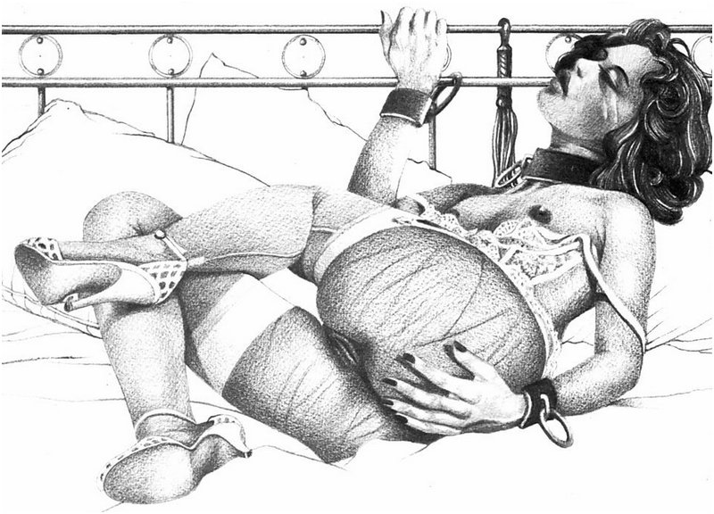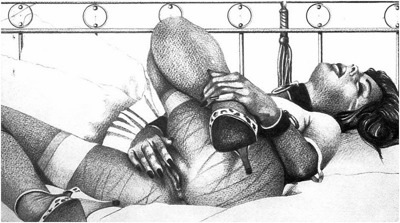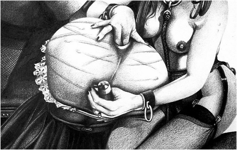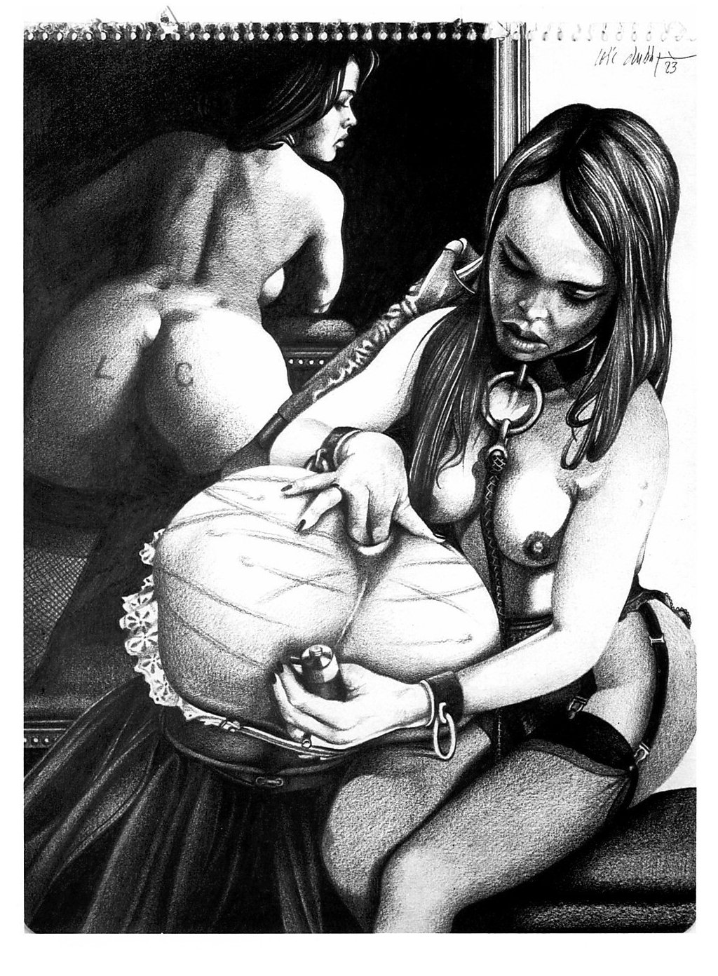 My own viewpoint, I think, has long been plain. What I like best about (to use today’s example) the artwork of Loic Dubigeon is that despite being coded as “serious BDSM” artwork complete with Story of O type genital piercings and intimate branding, many of the images reveal a kinky worldview where even heavy players are easily distracted into sexual pleasure, despite (or perhaps because of!) serious whip welts that must have been exquisitely painful to receive.