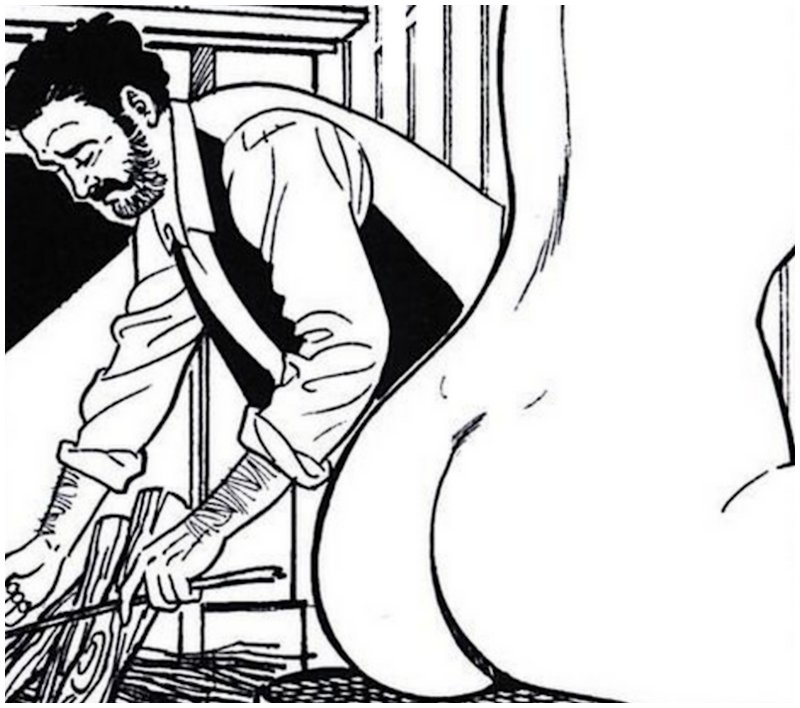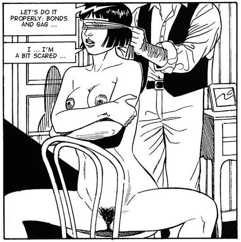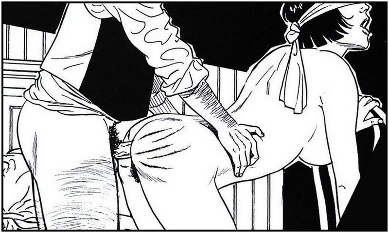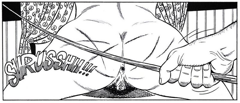 Our spanking protagonist in these Muratori-drawn panels from Les verges du désir shows off his kink improvisational skills by rummaging in the woodbox for a stick to use as a switch. In this more modern 21st century era where woodboxes are a bit scarce, my favorite improvised spanking implement (and the first thing I look for in a cheap hotel room) are those round or octagonal plastic dowels that hang in every window with Venetian blinds. It’s a ubiquitous field-expedient cane that generates just the same number and howling volume of complaints as you would hear if you were using the “real” rattan equivalent!