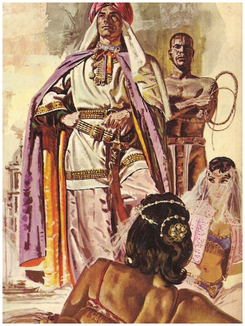 I’m thinking a harem is wasted on this arrogant sultan. Not only is he staring off somewhere high into what he imagines is his noble future, completely ignoring the women languishing on his cushions, but also he’s got a guy following him around with a whip. Man, if you’re too busy to whip your own harem girls, you definitely need to take a hard look at your life’s priorities!