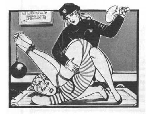 If I correctly understand the plot of Lady In Rubber, these are not actually a cop and a prison inmate. The bondage paddling tableaux is actually an entry in a kinky costume contest: