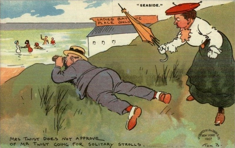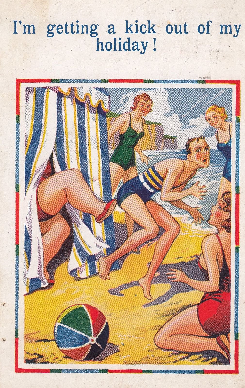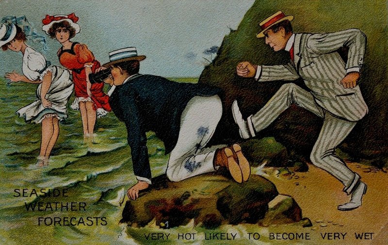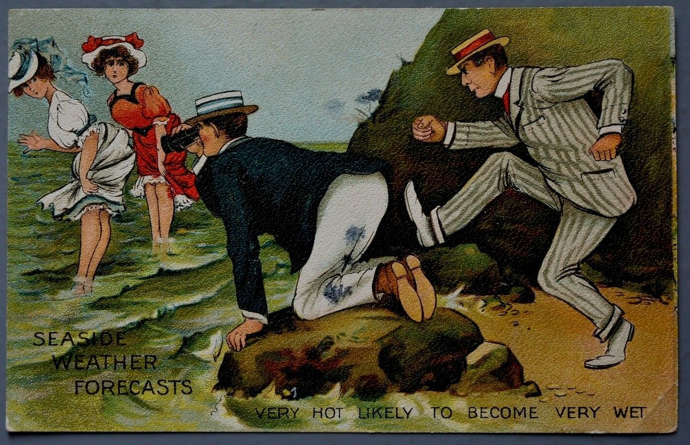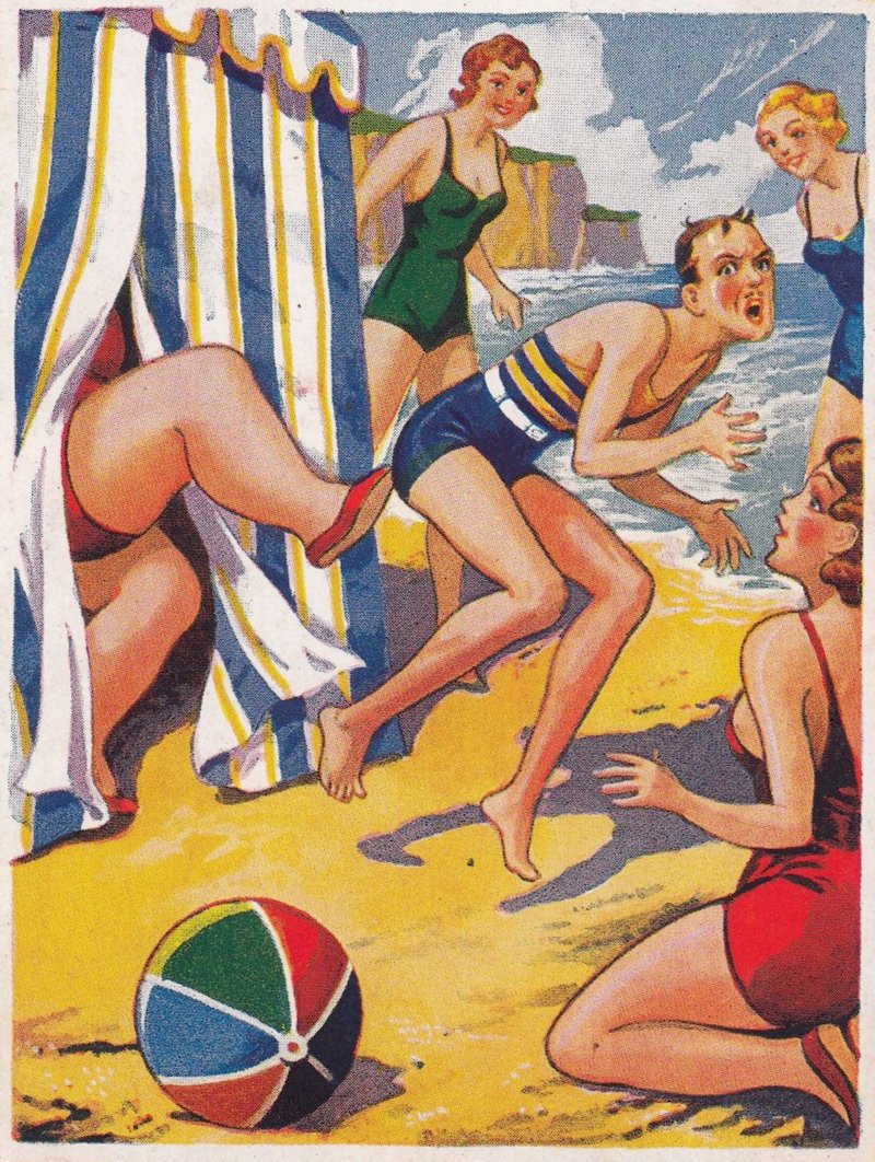 But oh! How it used to be different. I can’t say whether unwelcome horndogs snooping around beachside changing tents were a genuine social reality or just a social obsession of the times, but either way, we have endless examples of them recorded in comic artwork. Sometimes, we see them just chilling and enjoying the view. But much more often, they being kicked around by their enraged victims, thumped with a parasol by an angry spouse, hauled away by the beach police, or even booted off a rock into the sea by a random passer-by.