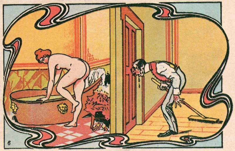 Go back 120 years, and porn was mostly underground, rare, expensive, a privilege of the rich. Even after porn magazines became more common, they often weren’t casually available outside urban centers. If you weren’t married or paying a sex worker, the sight of naked flesh “in the flesh” was usually unobtainable. Is it any wonder that horny dudes were alert for opportunities to peep through keyholes, binoculars, undraped bedroom windows, unguarded doorways, and cracks in privacy fences?