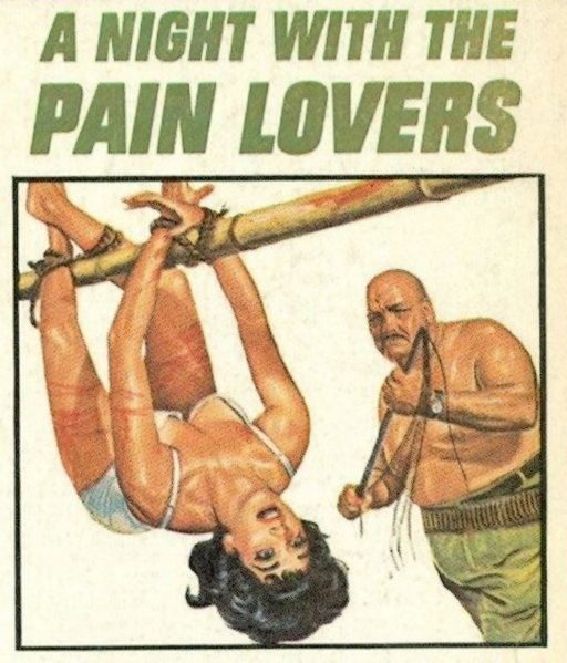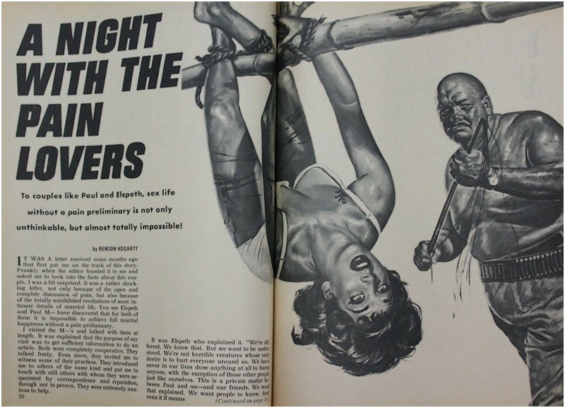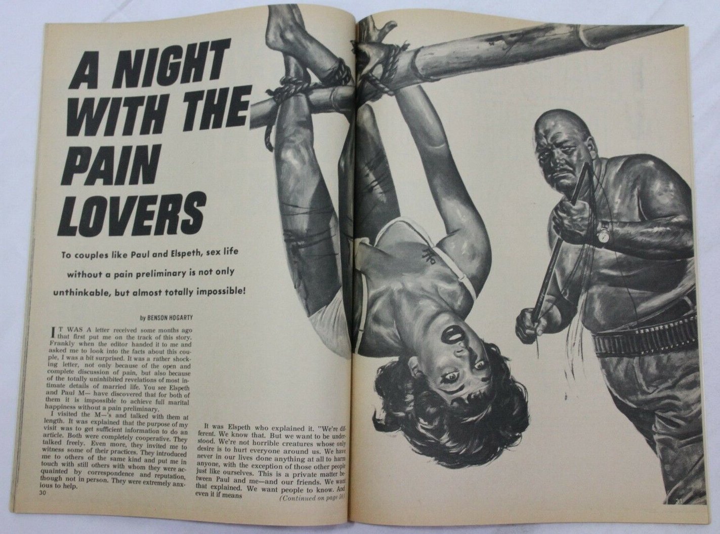The postage-stamp versions I had seen previously didn’t make it easy to see the whip welts arising on our helpless heroine’s arms and legs. So you might imagine I was pleased to come across a photo of the inside illustration spread (featuring the same artwork, larger, in black and white) even though the image is distorted by having been photographed with the magazine not fully open: