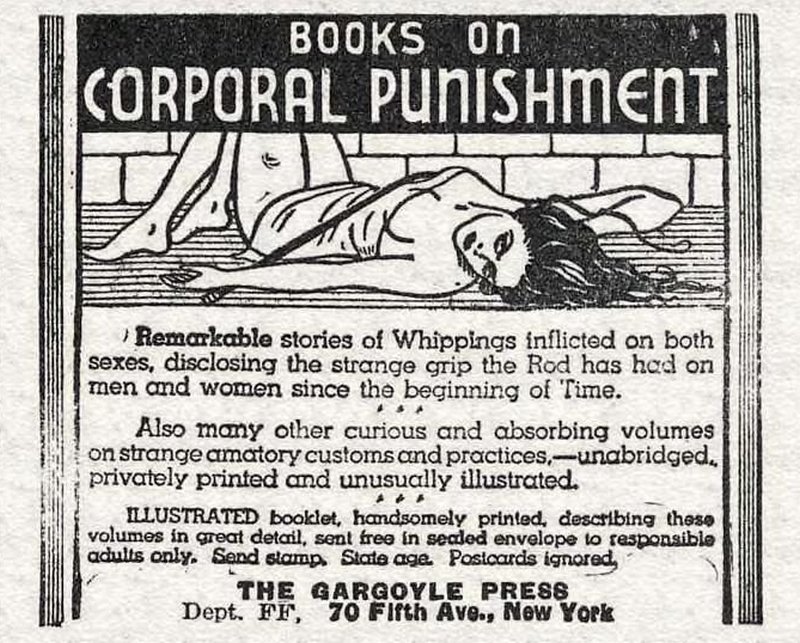For so long as there has been erotic spanking literature, there’s been a need to advertise the stuff. This curious advertisement appeared in the back pages of the November 1935 issue of La Paree, which despite its exotic titling was a US men’s magazine published in Dover, Delaware. I sure would enjoy seeing a copy of the “illustrated booklet, handsomely printed, describing these volumes in great detail” — wouldn’t that be fun?
