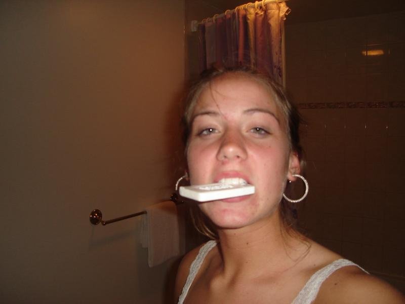 You can tell this mouth soaping isn’t done yet, because our punished young lady is trying to hold a dry bar between her teeth with minimal suds or tongue contact. Perhaps she got sent to the bathroom to wash her mouth out with soap, and thinks she’ll get way with this half-hearted effort: