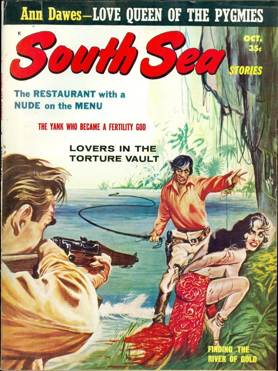 I know that oozing whip welts and dudes pointing guns is a bit more lurid than the usual Spanking Blog fare, but I do love the old pulp covers all the same. This is a cover illustration detail from the October 1961 South Sea Stories, illustrating the story Finding The River Of Gold: