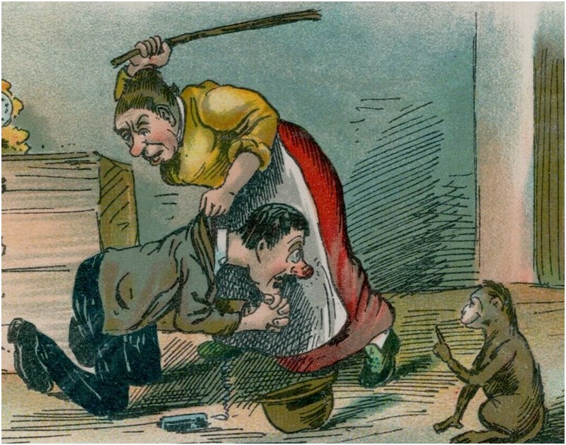 I think we are to take this unfortunate man as a drunkard of a husband, being disciplined by his strict wife for coming home intoxicated. But what is the role of the monkey?