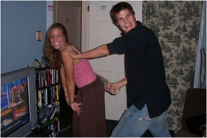 As the story goes, this photo comes from a fraternity house with an enlightened policy on women who visit. A ceremonial paddle swat is required for all: