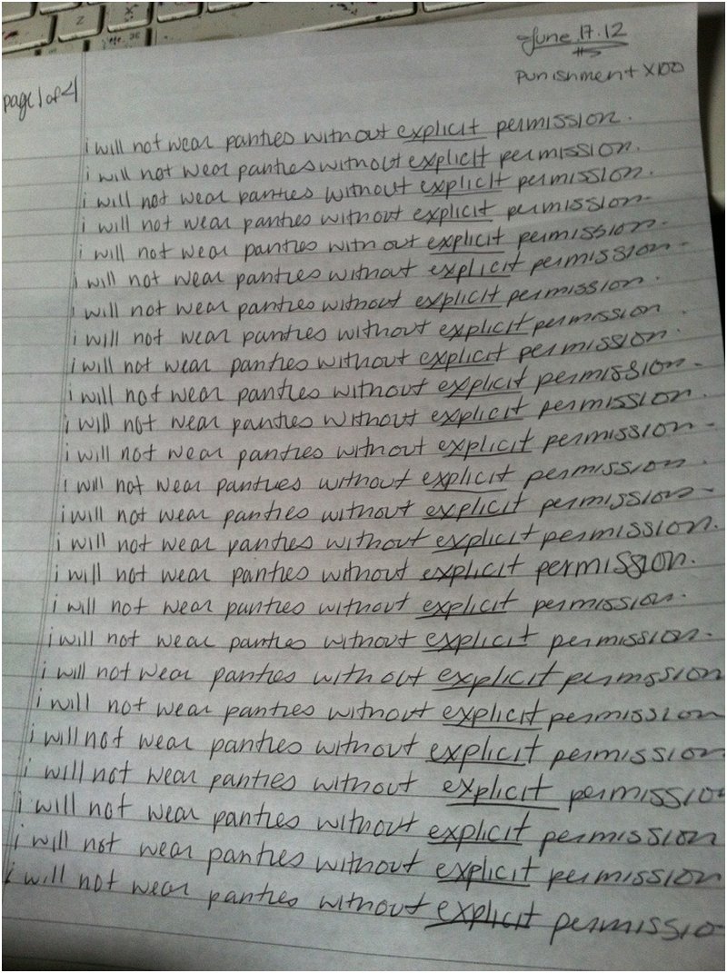This unfortunate submissive learned the hard way: wearing panties in her relationship is a privilege, not a right! How sore do we think her bottom was while she sat on a hard kitchen chair writing these out?