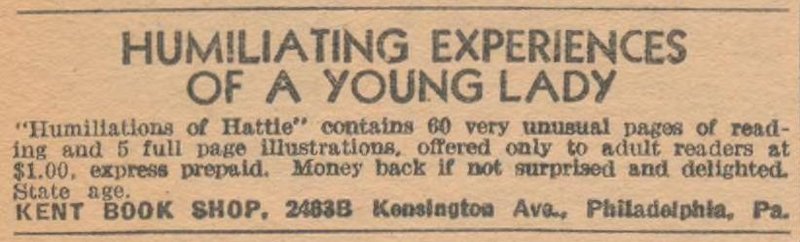 “Humiliations of Hattie” contains 60 very unusual pages of reading and 5 full page illustrations, offered only to adult readers at $1.00, express prepaid. Money back if not surprised and delighted. State age.
