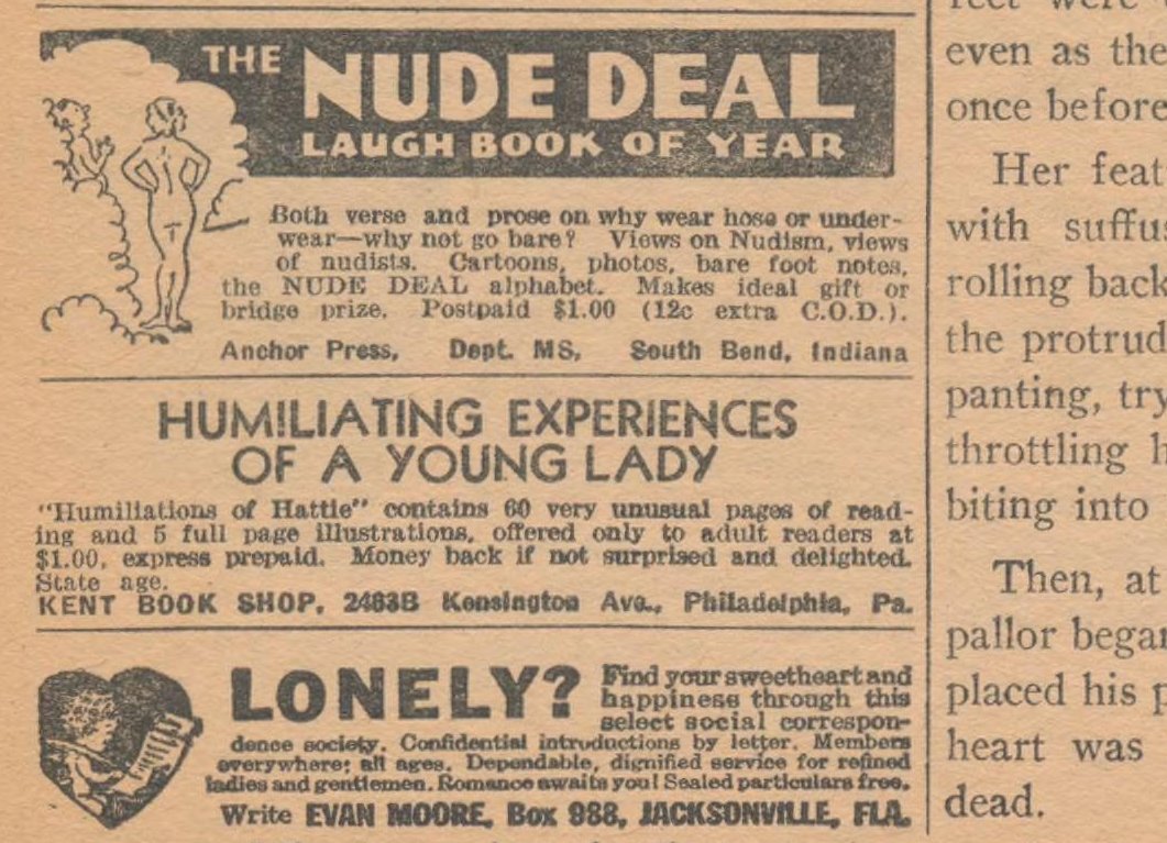 Amongst the dubious advertisements in the back pages of the July 1937 issue of Spicy Mystery Stories, we find the following curious notice: