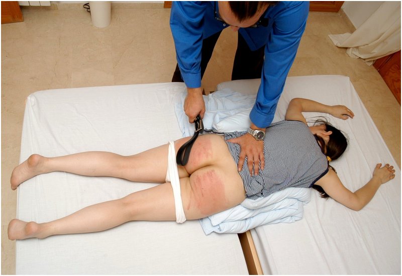 The belt spanking she got was pretty harsh. But it wasn’t over when it was over, if you know what I mean. Once it was all done, he made her pose over the pillows again for a trophy photo that showed all her spanking marks: