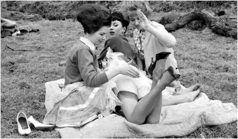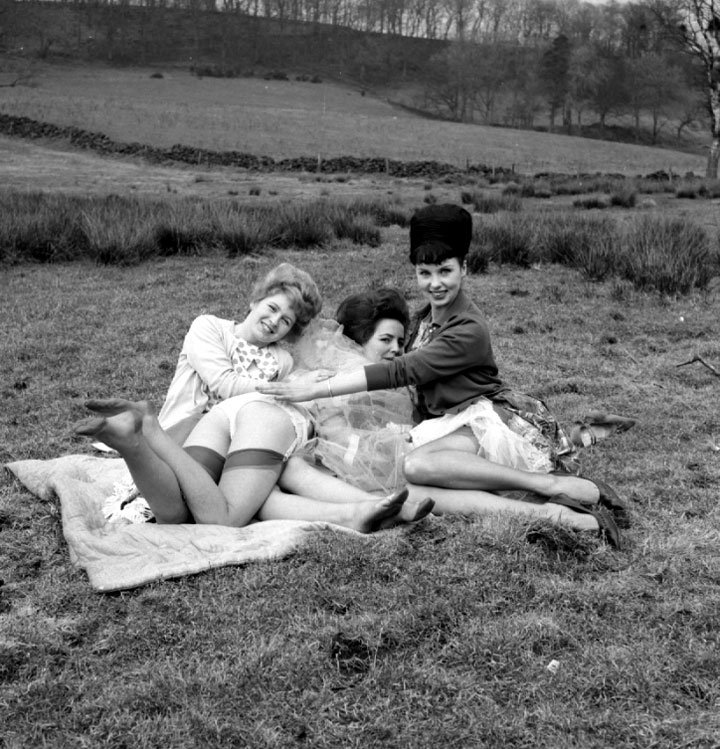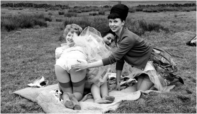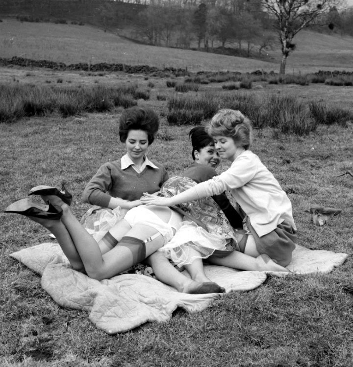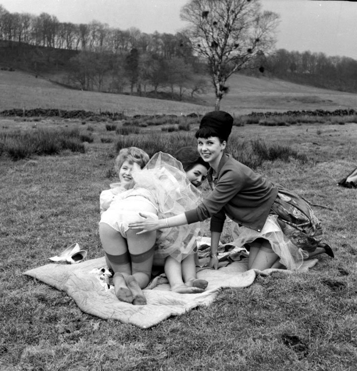 So what do you get when you take three pretty lingerie models from the old Spick And Span pinup magazine, drive them out deep into the bucolic British countryside, and turn them loose among the cow patties on a nice thick cushiony blanket? A lesbian spank picnic is what you get: