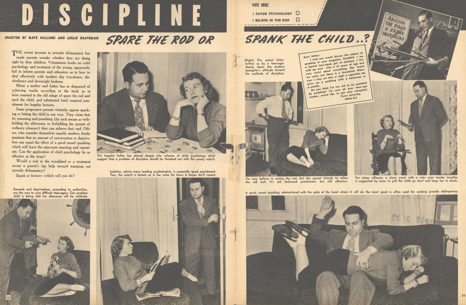 In the Febuary-March 1949 issue of Glance magazine, there was a two-page article on domestic discipline that pretended to inquire about the proper punishments for delinquent teens. But of course it was all just an excuse to publish a tame spanking photospread of adult models “enacting” the punishments discussed in the article. Here our “delinquent” model is fisting her dry eyes to create the implication that she’s in tears: