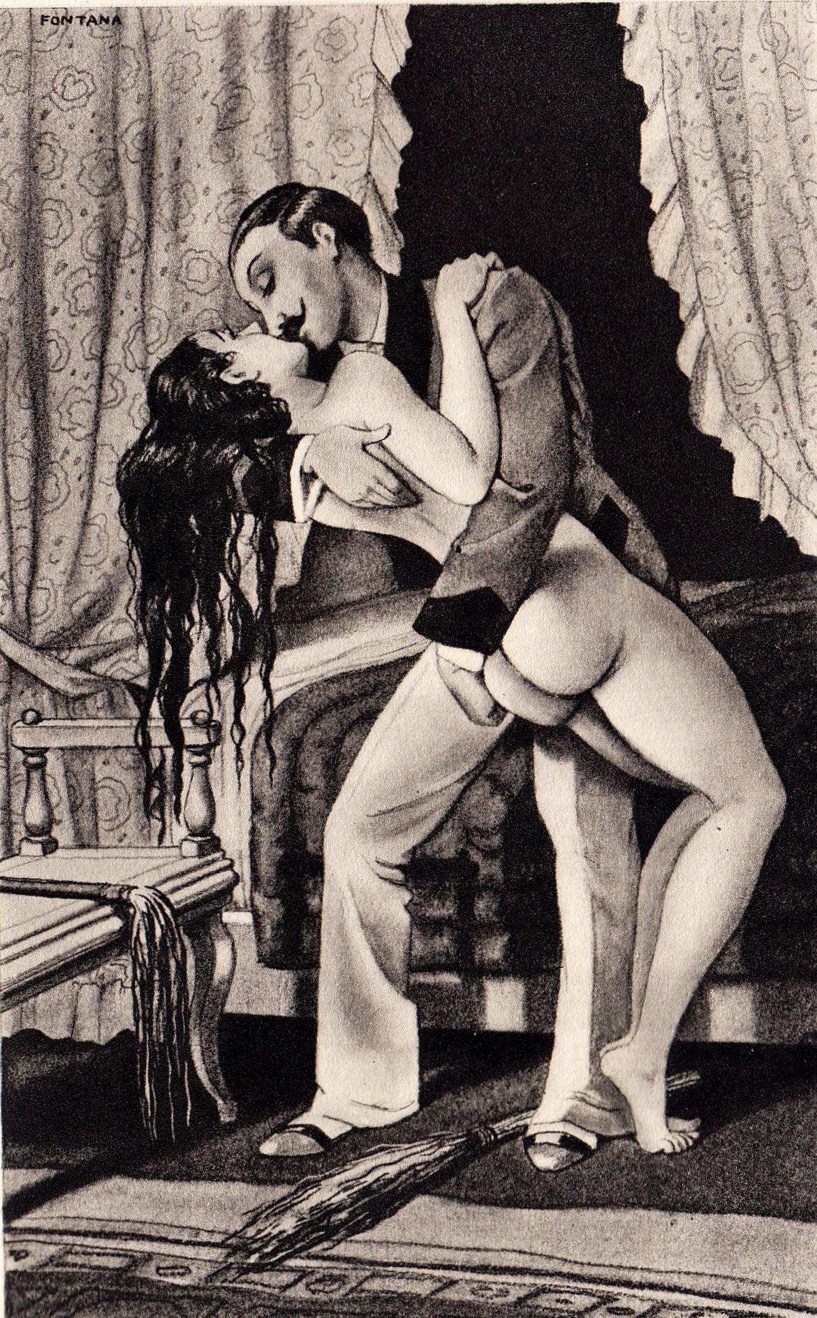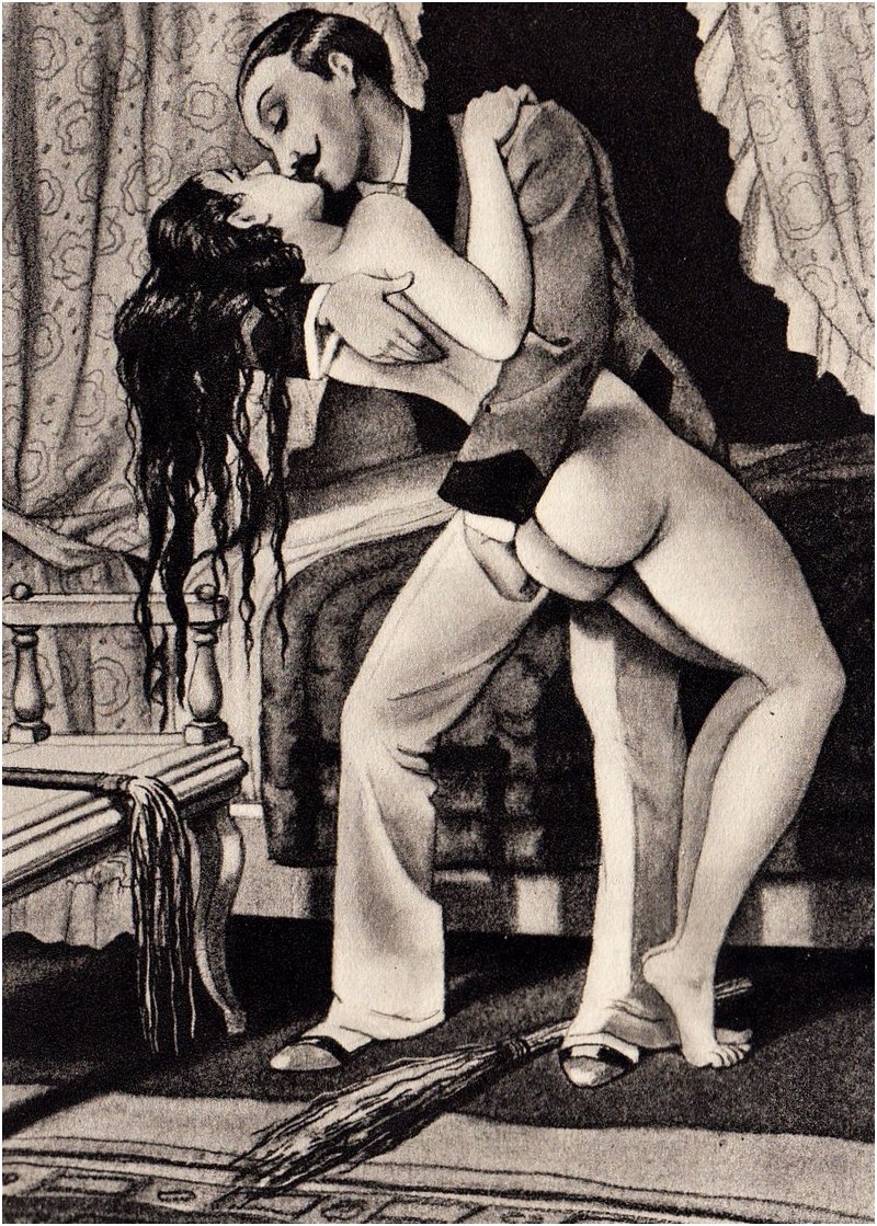 Since there are no whip or birch marks on her bottom, I can only assume that our unfortunate miss has been stripped for punishment and her disciplinarian is kissing and fondling her to reassure her that she is loved, punishment notwithstanding: