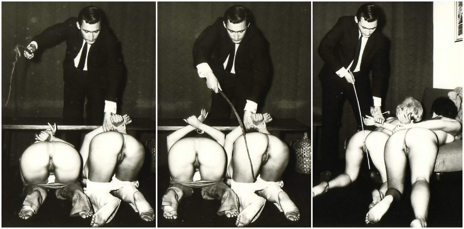 We’ve seen this stern suit-wearing man punishing a blonde before with his hand and a cane. But now she has a naughty brunette friend and there’s a formal bondage whipping in progress. In the final panel, they have less clothing, and he seems to intend to cane their pussies: